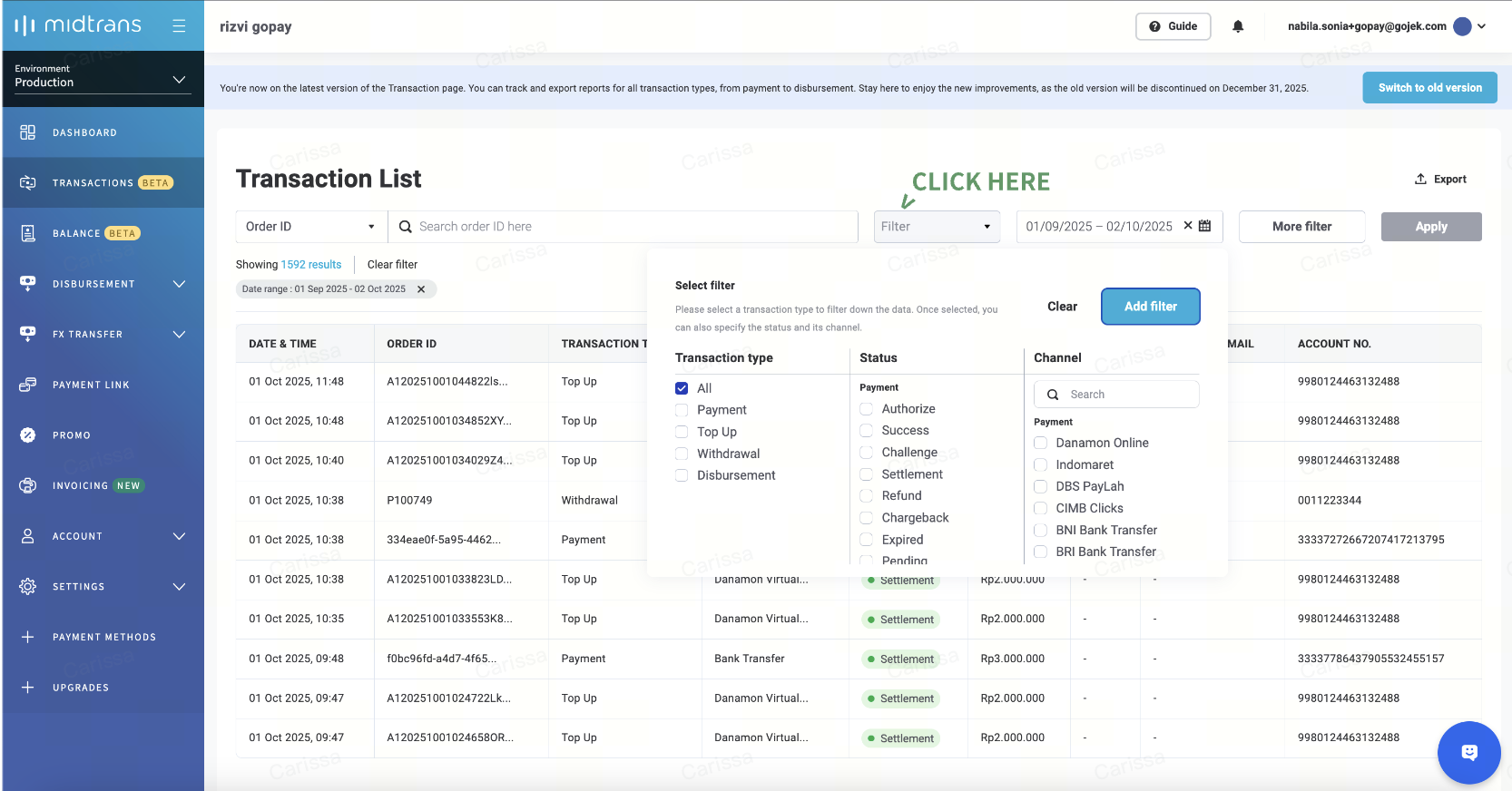 Transaction page and Balance page in Midtrans Dashboard.