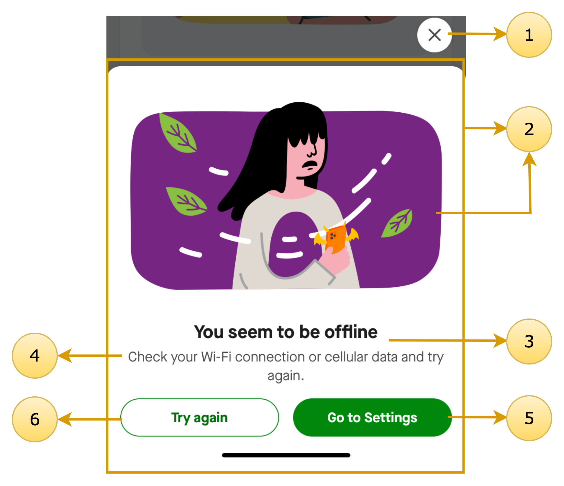 ![]() | 1. closeButton 2. card 3. title 4. description 5. primaryCTA 6. secondaryCTA |