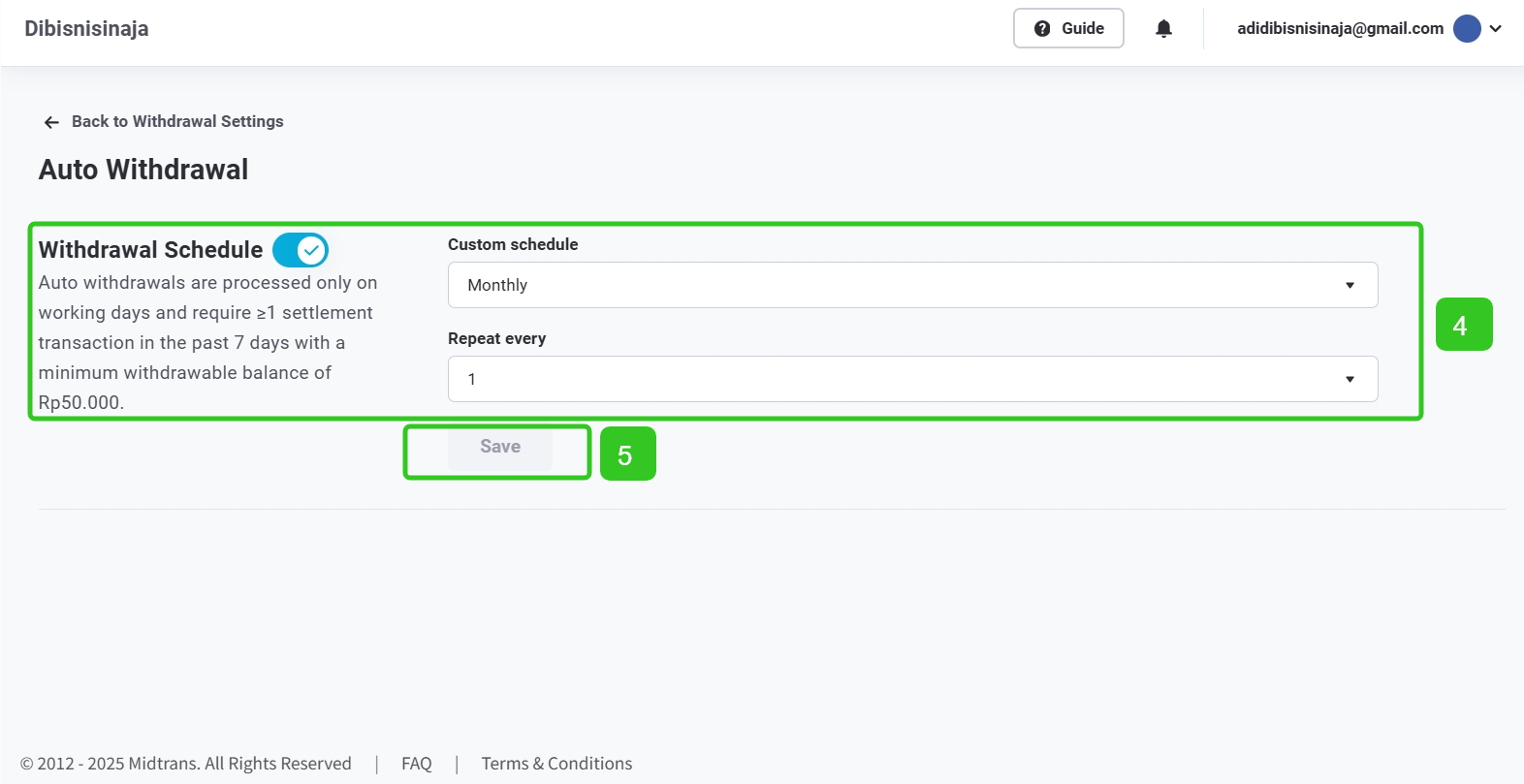 For Automatic Withdrawal, make sure the funds that can be withdrawn are more than the same as Rp. 50,000. If at the time the withdrawal schedule automatically runs but the funds are lacking, then the withdrawal process cannot be done until you wait for the minimum funds to be fulfilled. If you don't have any successful transactions within 8 days before the schedule, the automatic withdrawal wouldn't work, so you could do a manual withdrawal to get your fund.