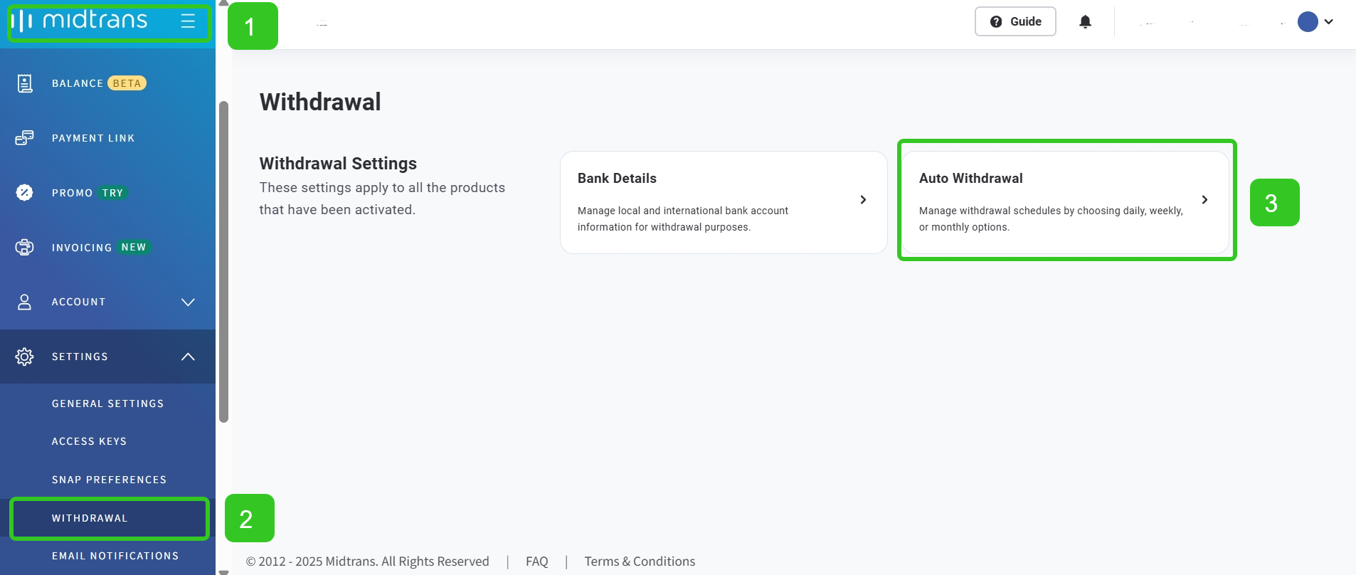 How can I receive money accumulated in my Midtrans merchant account (withdrawal)?