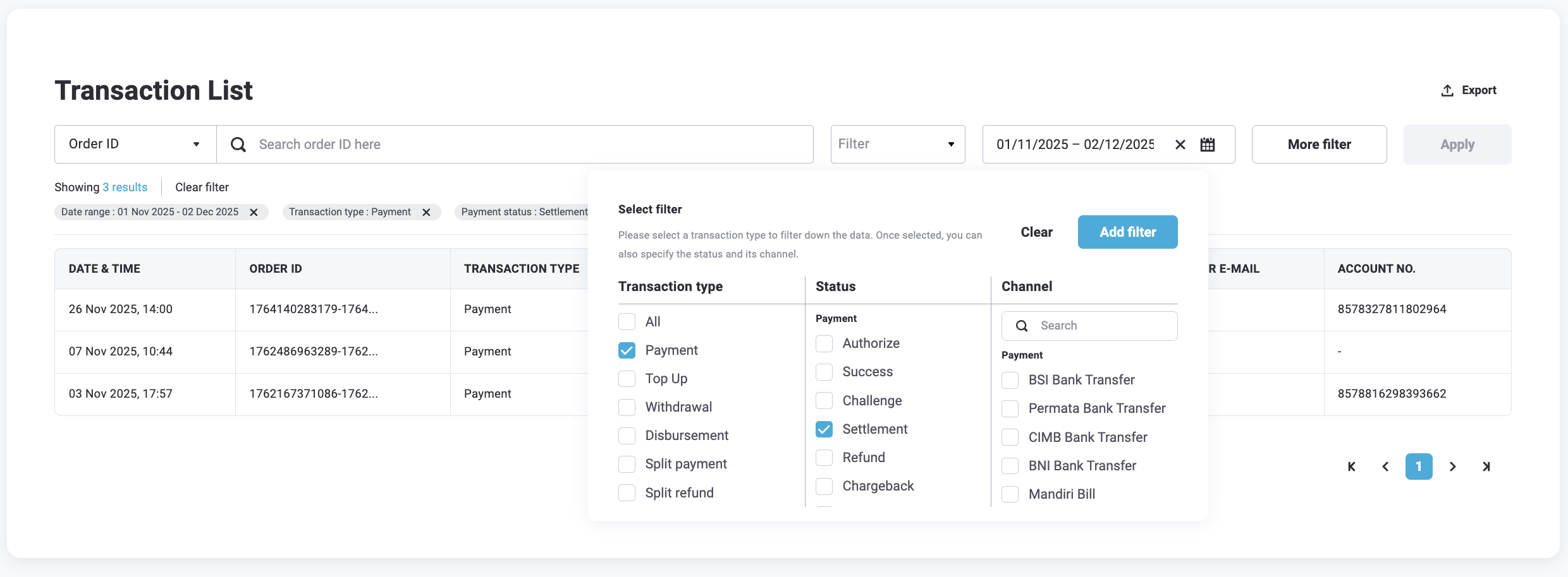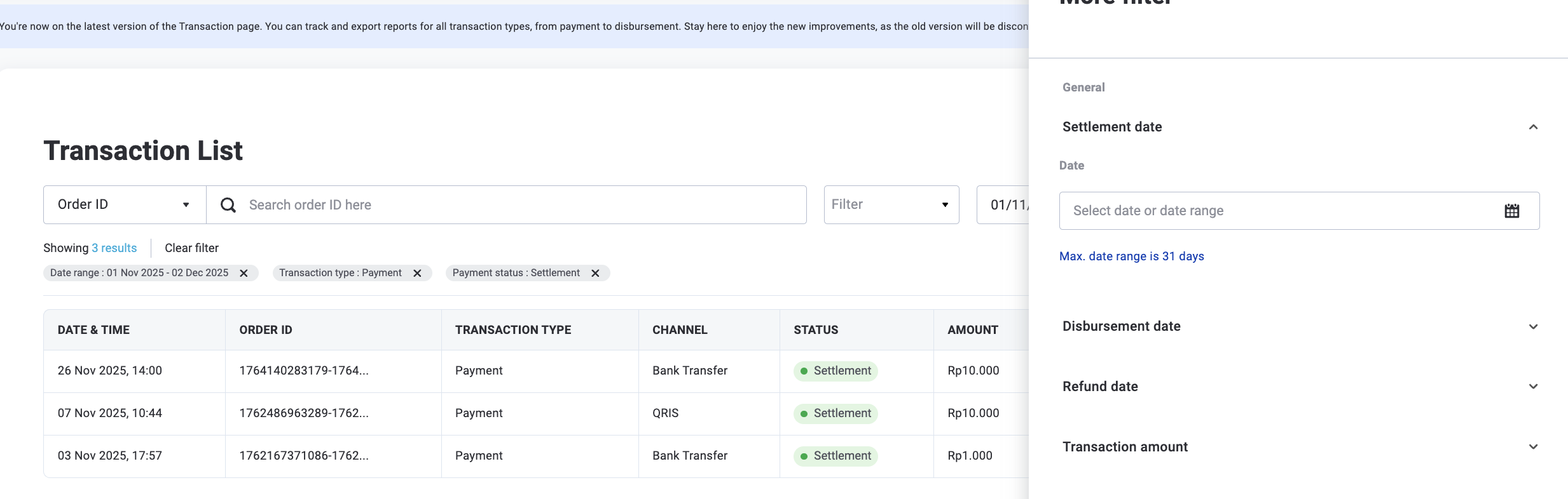- Quick filter - Search using unique identifiers in the search bar, such as: Order ID, Transaction ID, Reference No, Customer email, or Notes (Disbursement only)