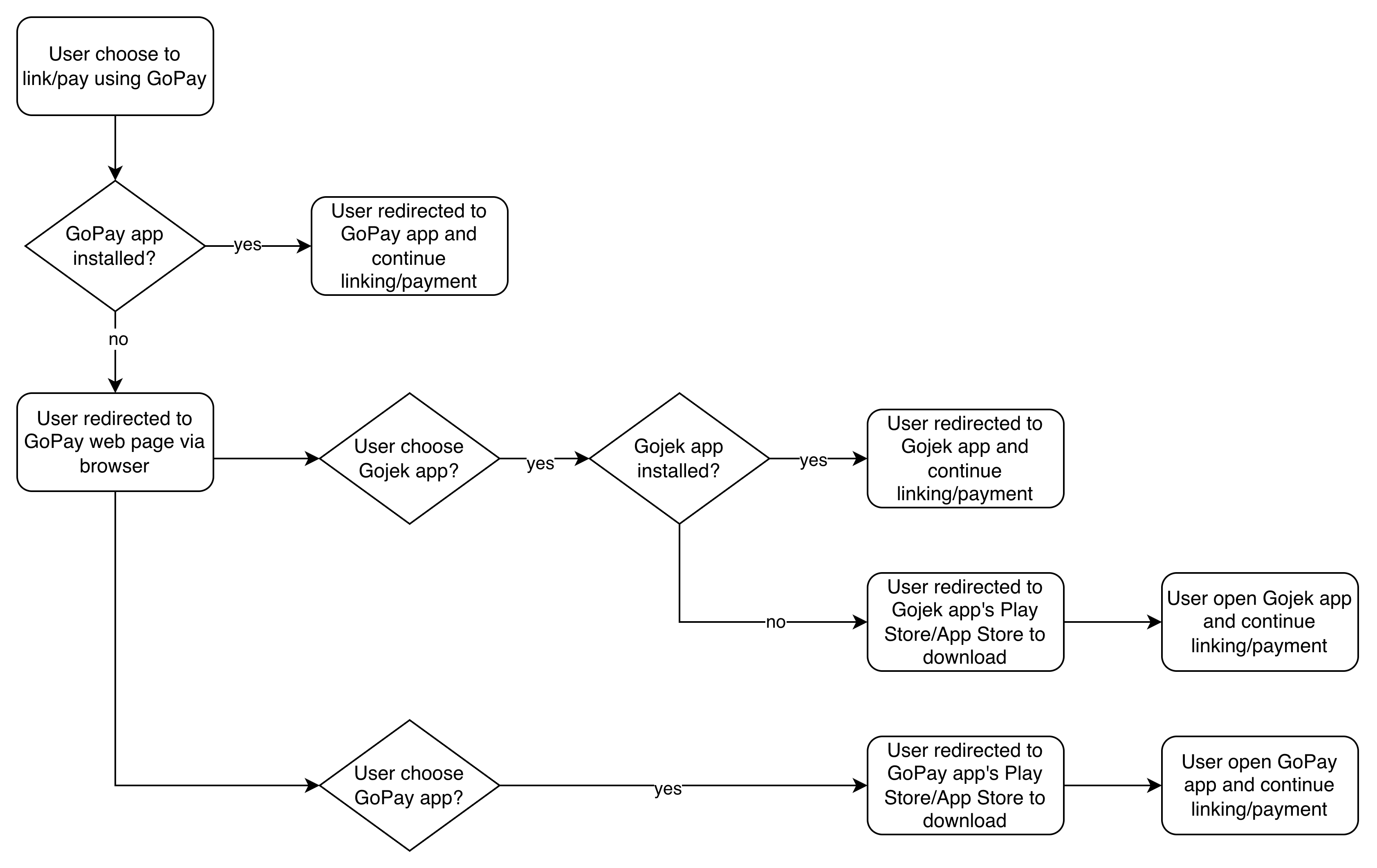 | User has Gojek app only | Redirected to Gojek app | Redirected to Gojek app | Redirected to download GoPay app or continue in Gojek app | Redirected to download GoPay app |